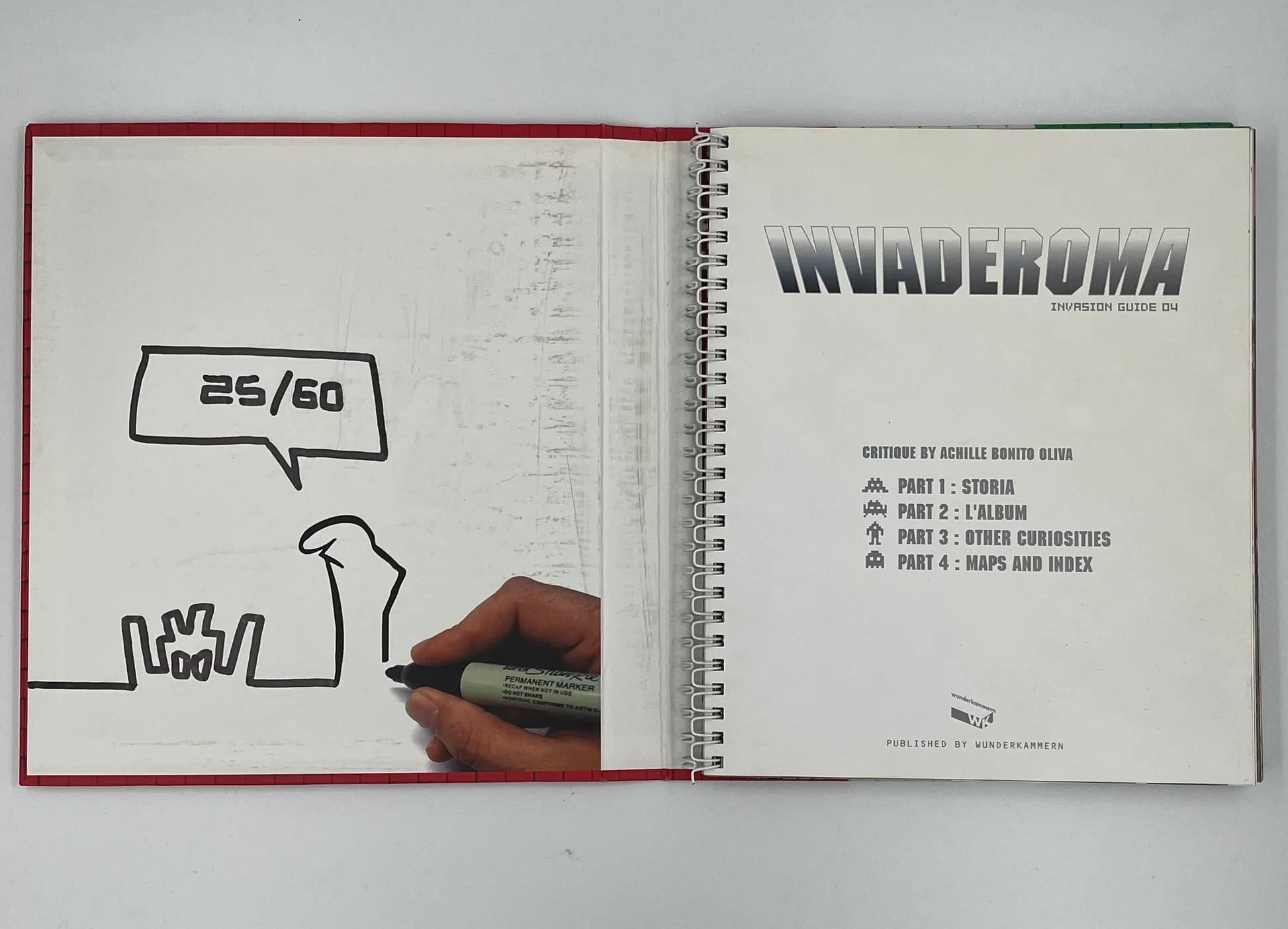 4000 is an Invasion Guide about the 4000 Invaders located worldwide. Each mosaic is recorded in detail, including a code and date for each piece. The exhibition under the same title is a solo exhibition taking place at Over the Influence, Paris, France in 2022-2023, celebrating the 4000 Space Invaders installed worldwide.